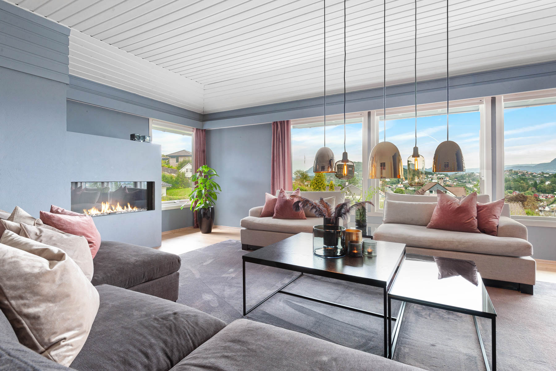 Stue fra eldre villa med nydelig utsikt over Bergen Sentrum og Løvstakken. Cognacfarget sofa mot nøytrale toner